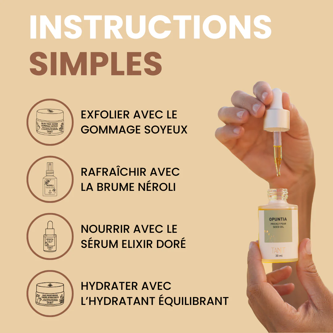 Mettant en valeur l'huile précieuse de pépins de figue de Barbarie (alias l’Élixir de Jouvence) et l'essence délicate de Néroli, chaque produit est soigneusement conçu pour préserver la jeunesse et l’éclat naturel de la peau tout en apaisant l’esprit et l’âme.